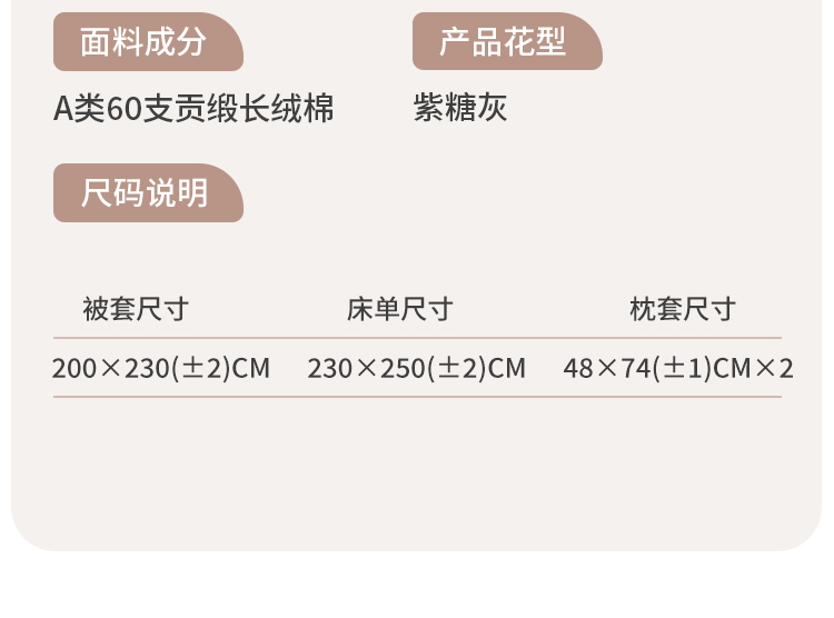 规 格:被套-200×230(±2)cm 床单-230×250(±2)cm 枕套-48×74(±1)cm×2 面 料:A类60支贡缎长绒棉 花 型: 紫糖灰 / 松绿